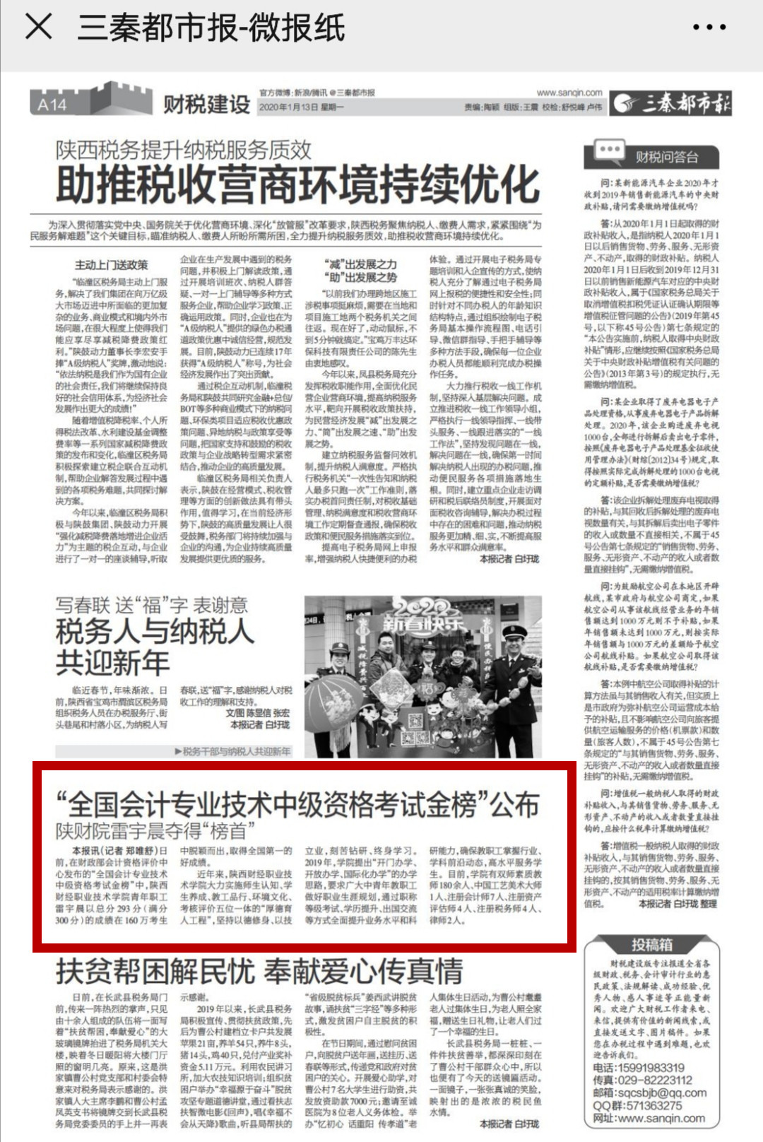 本报讯(记者 郑唯舒)日前,在财政部会计资格评价中心发布的“全国会计专业技术中级资格考试金榜”中,陕西财经职业技术学院青年职工雷宇晨以总分293分(满分300分)的成绩在160万考生中脱颖而出,取得全国第一的好成绩。
