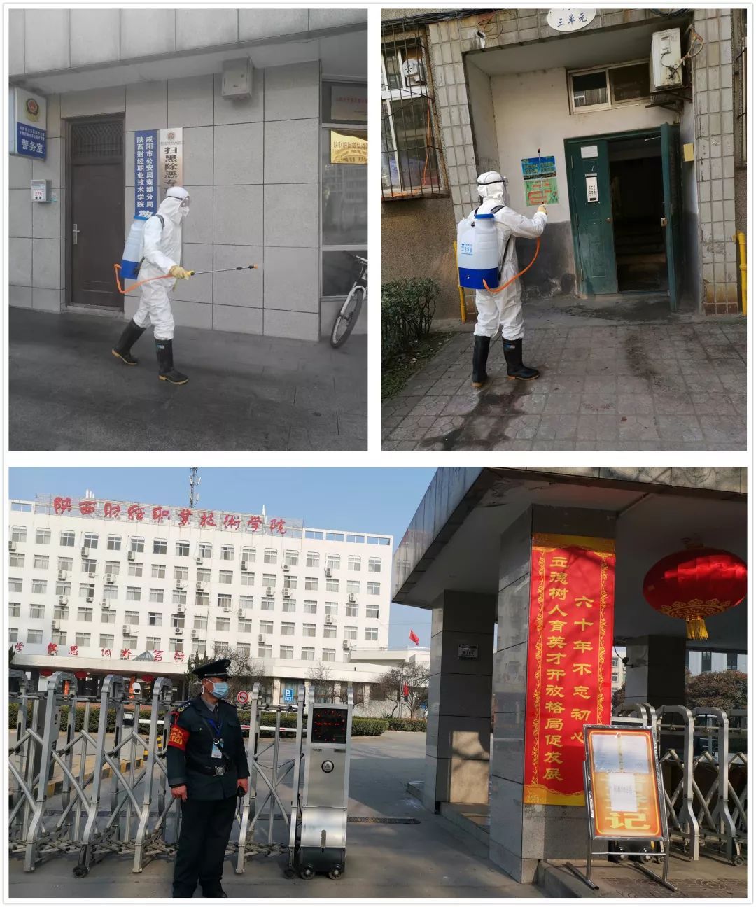 学院总务处多方联系,购置了一批口罩、消毒药物等物资,安排好校医院值班,积极对接当地防疫部门做好疫情处置,认真做好各项保障工作。为了减少细菌滋生,营造健康工作生活环境,学院开展环境卫生整治,坚持对办公楼、大门出入口、家属院及各楼道等重点区域和场所喷洒药物进行消毒,做到卫生无死角,消毒无空白。