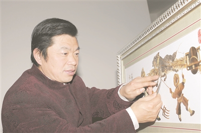 贺兴文正在制作麦秆画。(资料图)