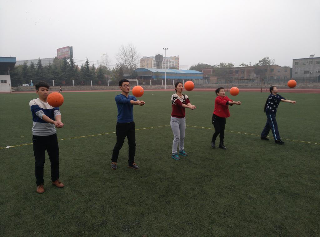 会计一系主任马西牛老师、学院团委书记窦曼娟老师、会计一系学生科长贺适老师及一系全体辅导员老师参加了活动开场仪式。领导及老师们亲临指导、助阵使参赛队员们感到十分温暖,马主任为本次比赛鸣哨开场。本次比赛采取小组计分制。参赛学生共有200余人,每5人为一小组,每5名裁判员单独计数并合计每组掂球总数。参赛选手神情专注,自发组成的拉拉队也给予队员们极大地鼓舞和帮助。队员们赛场上挥洒汗水、奋斗拼搏,每一次掂球都是凝聚着智慧与团结,尽显他们青春与活力,整个操场上充满了喝彩、呐喊、助威、欢乐的声音。