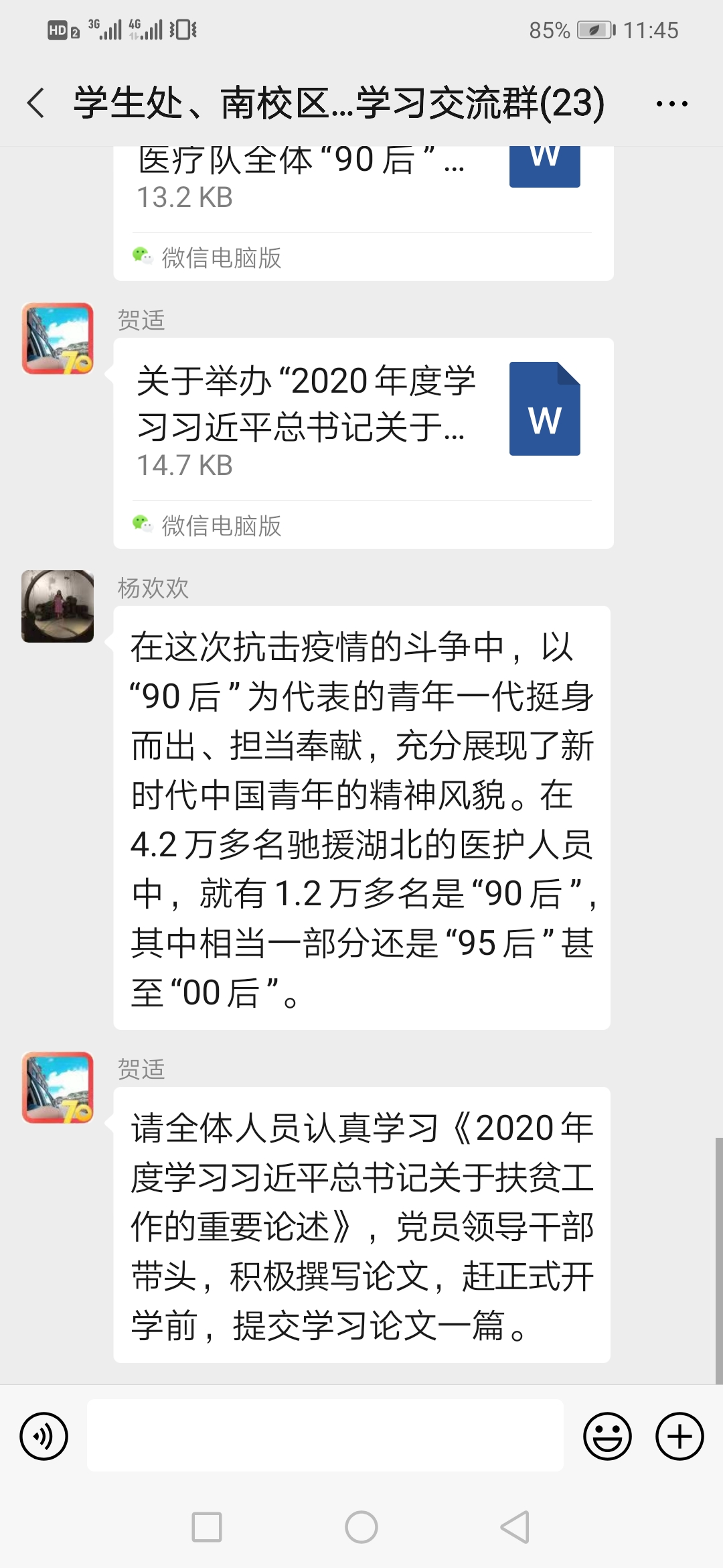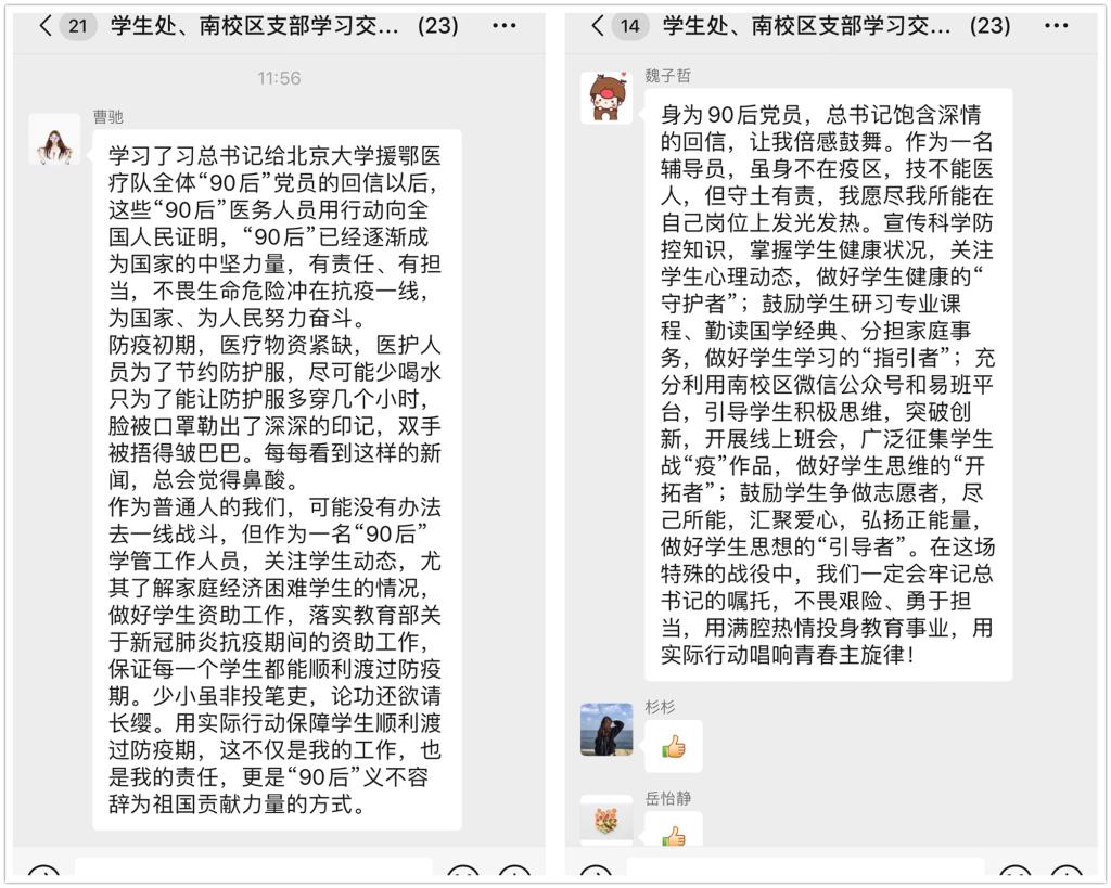 习近平总书记在回信中对青年一代的肯定和殷切希望,引发了党员同志们的热议。学生工作处和南校区“90后”党员曹驰、胡杉杉、魏子哲、岳怡静以及入党积极分子贾文平纷纷主动表达心声,争相发言,他们都表示要学习北京大学援鄂医疗队“90后”党员不畏艰险、冲锋在前、舍生忘死的精神;要牢记习近平总书记的嘱托,不惧风雨,勇挑重担,用行动来表达决心;要坚决落实好学院的各项疫情防控任务,做好学生的思想工作,维护学生的安全和稳定;同时为青年学子做好典范,在抗疫战斗中磨砺品质,在工作岗位上拼搏奋斗,做“有理想,有本领,有担当”的青年一代。