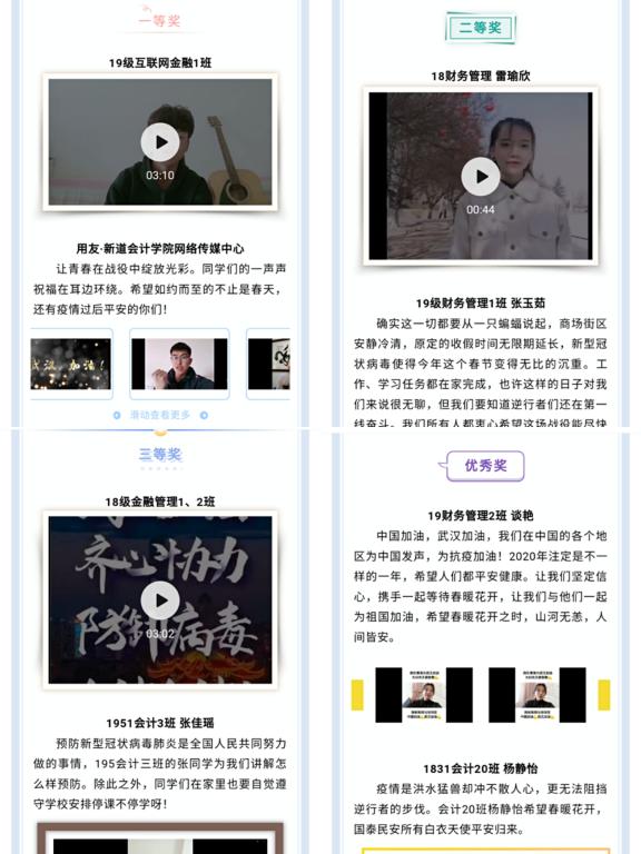 商学院团总支利用网络视频传播新模式开展“众志成城 共克时艰”抗疫微视频大赛。经过严密组织、精心筛选,最终评选出20部视角独特、感人至深的视频作品。视频被广泛上传至各大视频网络平台,点击量过万,视频中我院青年学生纷纷呼吁社会各界关爱一线医护人员,为积极解决其父母、子女的实际困难,缓解一线人员的后顾之忧贡献了一份力量。