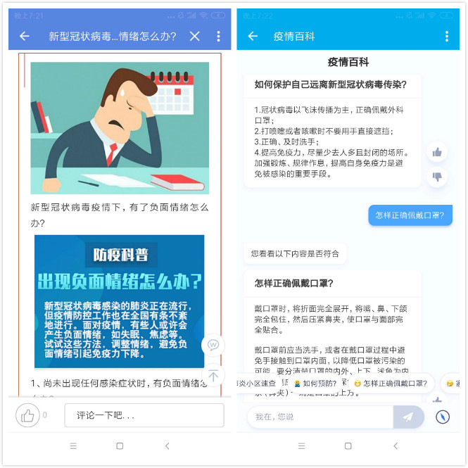 新冠肺炎疫情防控工作的关键是防,如何防呢?了解新冠肺炎疫情基本知识、掌握疫情防控方法是关键。学院易班平台积极分享疫情防控的科普知识,发布《权威提示:预防冠状病毒需要做到这六条》《疫情之下无法出门的大众心理调适》《遏制疫情,“防疫三字经”》等22篇文章,推广和宣传疫情防控方法,同时将学生处基于人工智能搭建的疫情问答平台接入易班,普及疫情防控常识,解答学生疫情防控疑问,增强了学生疫情防控的意识、提高了学生疫情防控的技能。