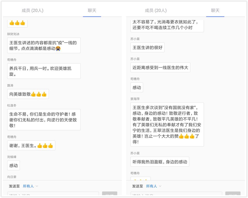 听完王医生的分享,全体教师都深感抗疫一线工作的艰辛与不易、平凡中的伟大,纷纷通过留言表达感谢和敬意。