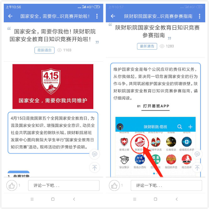 4月15日是我国第五个全民国家安全教育日,为普及国家安全知识、增强国家安全意识、动员全社会共筑国家安全的钢铁长城,学院易班面向我院大学生举行“国家安全教育日知识竞赛”活动。活动从4月15日持续到4月17日,在易班优课线上举行。