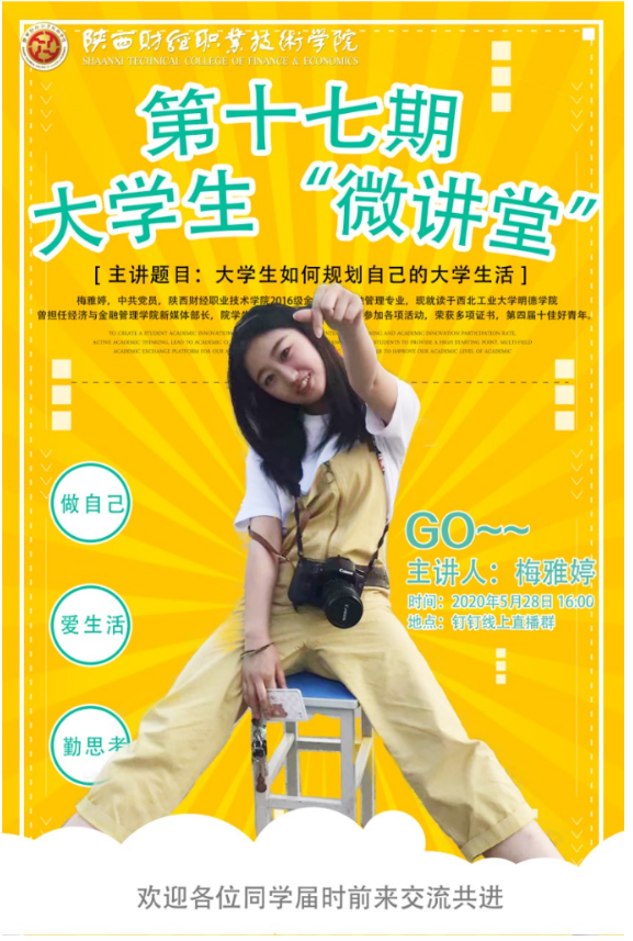 2020年5月28日16时,团委通过钉钉线上方式举行了2020年大学生“微讲堂”系列活动第十七期。本次“微讲堂”邀请了我院2016级优秀毕业生梅雅婷主讲,她以《如何合理规划自己的大学生活》为题给大家带来了一场精彩的讲演,800余学生参加此次活动。