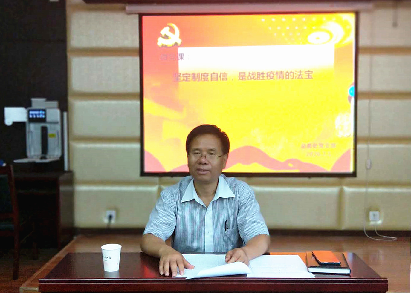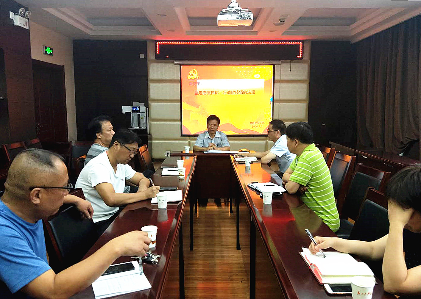 7月1日上午,总务处党支部全体党员在实训楼一楼会议室召开专题微党课暨支部组织生活会。会议由总务处党支部书记郭宝东同志主持,全体支部党员集体学习。