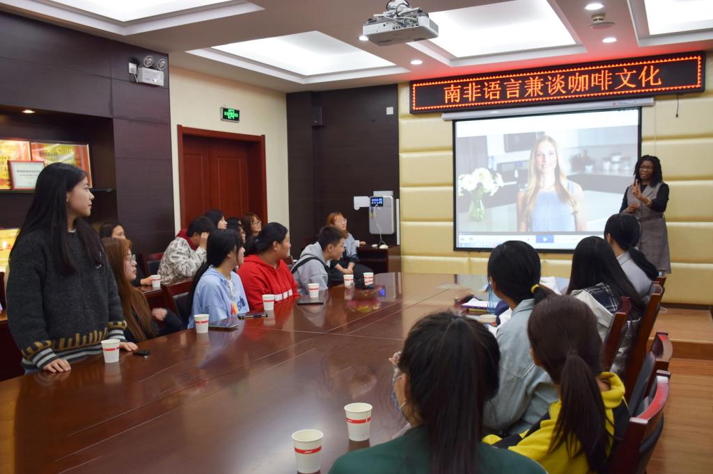 10月7日下午,学院在实训楼107室举办建校60周年校庆之“南非语言兼谈咖啡文化”活动。本次活动由国际交流与合作中心组织,外教Lila主讲,国际交流与合作中心负责人杨华进行双语主持,部分教师和学生代表共计50余人参加此次活动。该活动分为两大部分,第一部分同学们一起观看了学院国际交流一年来的成果视频;第二部分,外教向同学们细致讲解了南非语言及咖啡文化。
