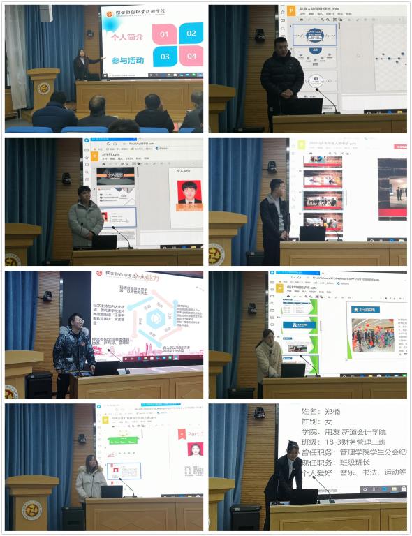 经个人申请与二级学院遴选推荐,用友·新道会计学院的8名学生、商学院和经济与金融学院各1名学生从全院学生中脱颖而出,参加本次评比答辩。他们或多才多艺、或全面发展、或社会实践、或自强不息、或学术科研,充分展现了在学习生活的某一方面具有突出特点和代表性,为其他学生树立了优秀榜样、提供了努力方向。