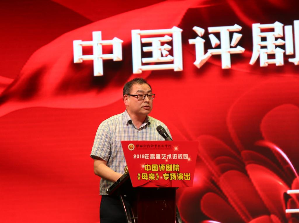首先,院长程书强致欢迎辞。他代表学院全体师生对中国评剧院的艺术家朋友表示热烈的欢迎和诚挚的感谢。对中国评剧院近年来的成就表示祝贺。他强调:一直以来,我院一直十分重视学生综合素质培养。不断深化艺术课程改革,建立了大学生综合素养拓展中心,成立了人文艺术学院,建立了中国工艺美术大师贺兴文工作室,举办了一系列丰富多彩的校园文化活动,夯实了我院“厚德育人工程”。他指出:我们能邀请到国家级院团莅临演出具有非常重大的意义,这将会在很大程度上推动我院校园文化建设,提升校园文化品位和师生的文化艺术素养。