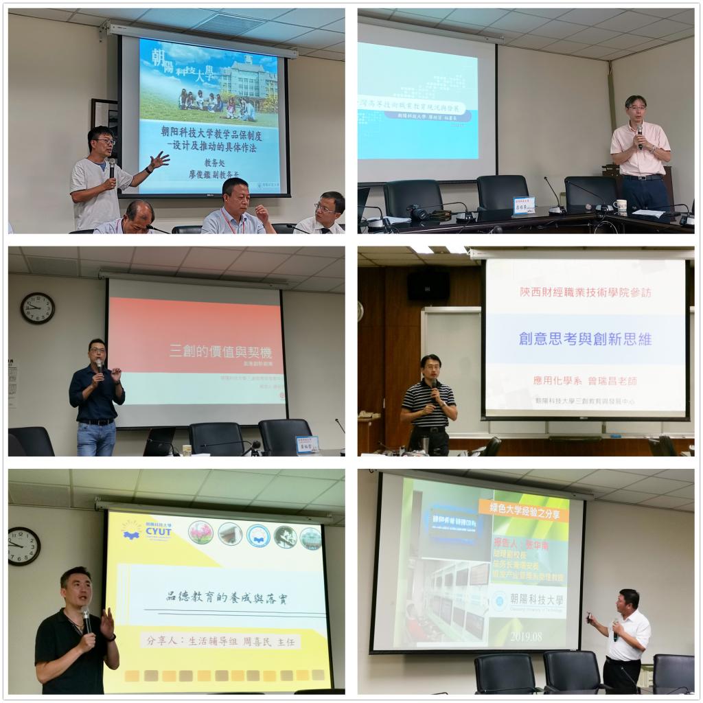 研修团听取了朝阳科技大学助理副校长兼教务长廖经芳、助理副校长兼总务长张华南等6人以《教学品质保证制度经验分享》《台湾高等技术职业教育的办学理念和办学经验》《三创教育的思与行》《创意思考工具与应用》《学生品德教育经验分享》《绿色大学经验分享》为题的专题报告,较全面了解台湾高等教育的发展历程及重点政策和朝阳科技大学的办学理念及办学思路,较深入学习了朝阳科技大学在办学过程的一些创新性、特色性做法和取得的经验。