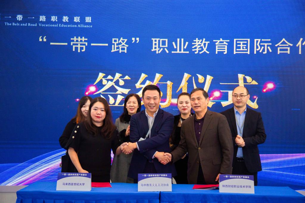 会议期间,我院以“一带一路”职教联盟理事单位身份展示了学院近年来国际合作交流及产教融合方面所取得的成果,并以此为契机与马来西亚世纪大学签订了合作框架协议、1+3+1专本硕连读项目合作培养协议,同时,举行了与马来西亚世纪大学、马中教育文化交流协会三方共建的马中高等人才联合培养基地的揭牌仪式。仪式由“一带一路”职教联盟秘书处负责人、陕西职业技术学院党委委员、党委统战部部长、国际交流合作部部长张颖娜的主持。