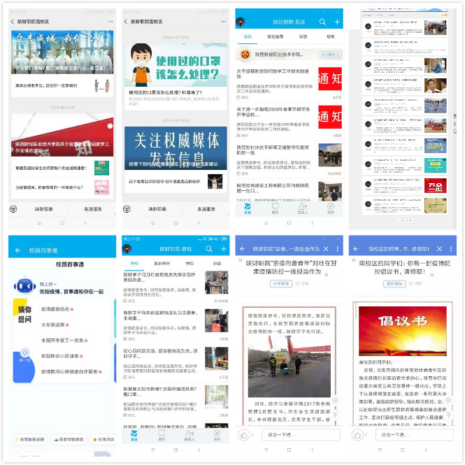 1月21日起通过南校区微信公众平台和易班平台先后推送了《预防冠状病毒,如何保护自己和他人》、《关于新型冠状病毒的十大科普》、《面对疫情别忘做好心理防护》、《陕财职院书记院长关于疫情防控致全体学生的一封信》、《钟南山在广东回应当前几大热点:疫情拐点还未到来》、《陕财学子韩宝丽在河北小村庄疫情防控一线勇当先锋》等共计100余篇的文章,内容包括学院疫情防控工作动态、疫情防控各项通知、疫情防控书信及倡议书、疫情防控权威指南、疫情防控先进事迹等。同时,南校区利用学生处基于人工智能搭建的疫情问答平台、防疫健康教育微课,对学生进行疫情知识的普及和疑问解答。