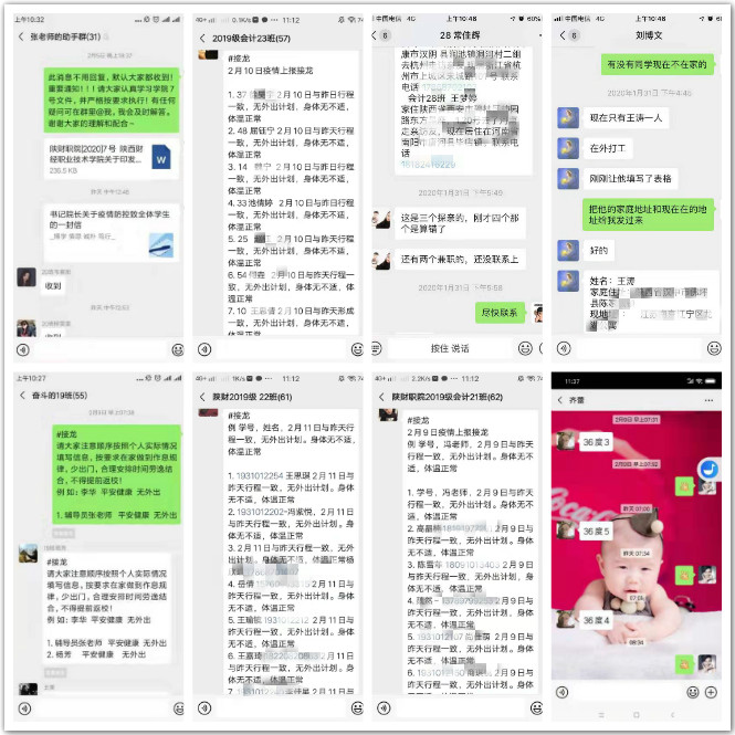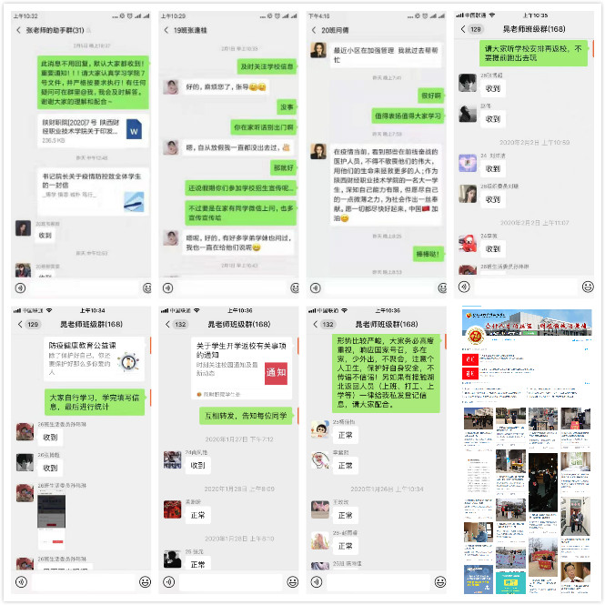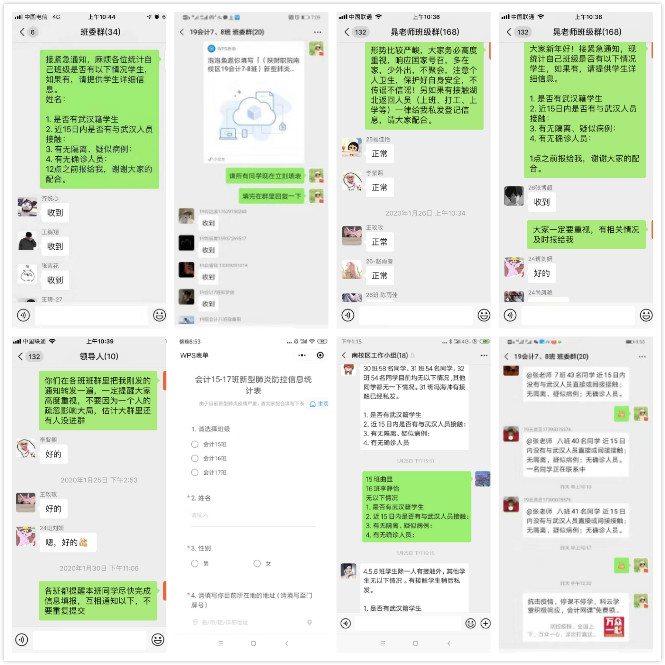 疫情防控是当前最大最紧要的任务,南校区各辅导员,密切关注学生动态,24小时保持手机畅通,通过微信、电话、短信等方式切实做好各项防控工作。虽然在寒假、在春节,但南校区每位辅导员都没有放松,在家办公,深入摸排学生相关接触情况、寒假去向情况,不间断对学生进行疫情防控安全教育、分享疫情防控指南,引导学生不信谣、不传谣、从官方权威渠道获取信息,对学生进行心理疏导,每天监测学生健康状况、每日上报重点关注学生的体温,及时传达学校延期开学、停课不停学等通知,确保学生的健康和安全,以及各项工作的顺利进行。