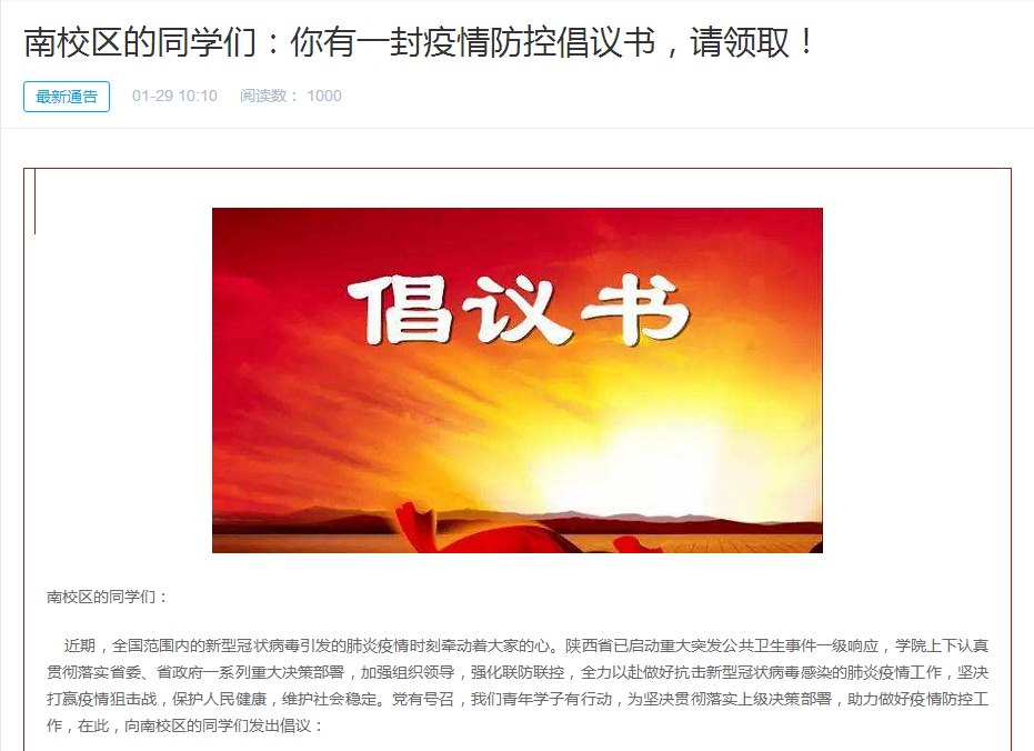 1月28日,南校区通过微信平台和易班平台向全体学生发布疫情防控倡议书,倡导学生们高度重视、提高防范意识、不外出、戴好口罩、不聚集、不信谣、不传谣、服从安排,共克时艰。