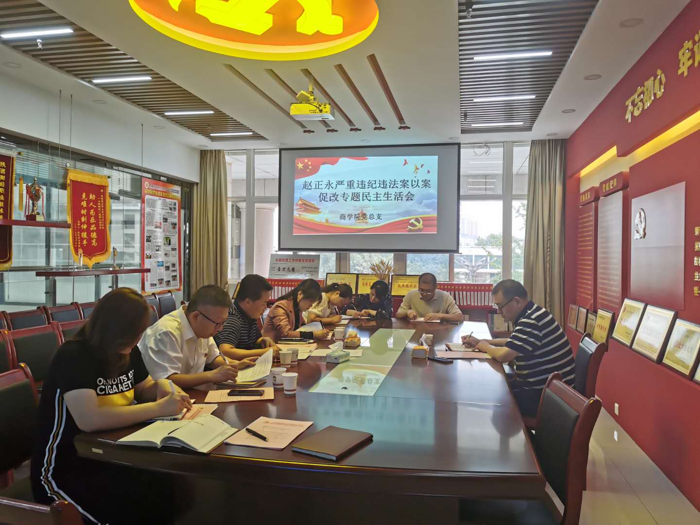 为了坚决肃清赵正永流毒和恶劣影响,提高自身党性素养,立足本职岗位干好工作,为学院发展凝心聚力。按照学院党委要求,2020年9月14下午,在综合楼二楼商学院省级样板支部活动室,商学院党总支召开赵正永严重违纪违法案件以案促改专题民主生活会。学院院长程书强莅临现场进行督导。商学院党总支书记张晓战、商学院党总支副书记、院长董媛、商学院党总支副书记、副院长李福顺、教师第一、第二、第三党支部书记和学生党支部书记共计7人参加会议。张晓战主持会议。