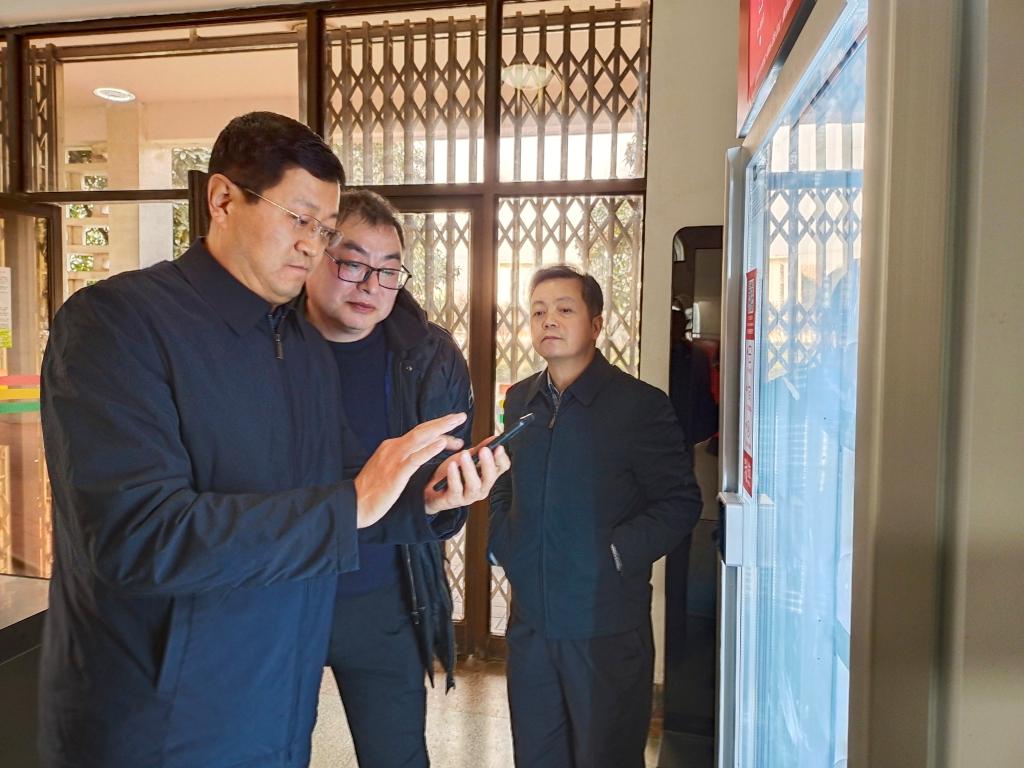 随后,张志华一行人来到人大期刊阅览室,查看了暖气、桌椅等硬件设施,并与正在学习的学生亲切交谈。图书馆门口的扶贫消费自动售卖机吸引了张志华的注意,他兴致满满的拿出手机,经过扫码、开门、取货、关门一系列操作后,顺利从自动售卖机中拿到了所购买的物品,并将零食锅巴送给了身边的工作人员,亲身体验了学院自动化消费扶贫的便利。
