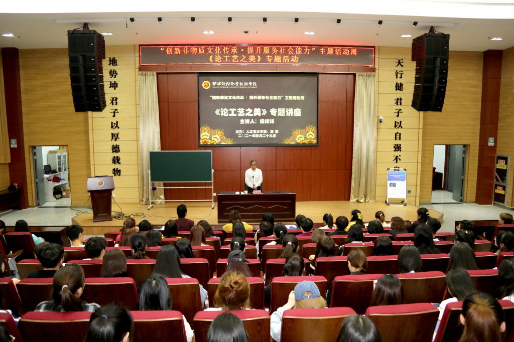 4月29日晚,侯样祥教授以《论工艺之美》为题为学院400余师生作专题讲座。他旁征博引,从材料美、工艺美、造型美、意境美、题材美等多个角度深入阐述了工艺美术制作技艺、创新研究、作品设计与赏析、文化传承等方面的内容。他认为首先应该对制作技艺进行深入的研究,要在造型上作减法,为观众留下想象空间,在发扬传承传统文化的同时多做有意义的创新尝试。