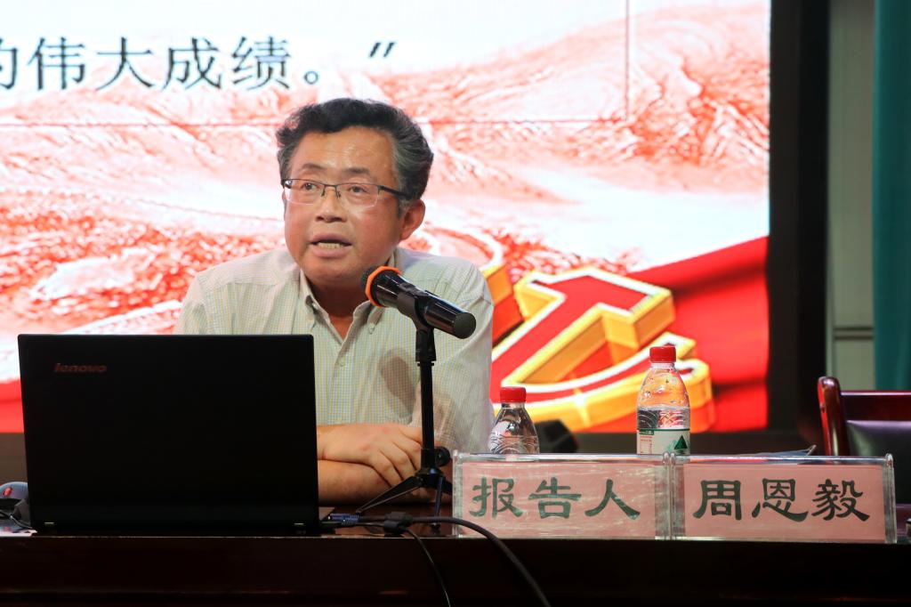 周恩毅从丰富的党史资料入手,通过梳理历史脉络、讲述党史故事、总结经验教训,深刻阐释了毛泽东在《〈共产党人〉发刊词》中所说的“统一战线、武装斗争、党的建设”三个战胜敌人的主要法宝。周恩毅在讲解过程中引经据典、深入分析,通过读原著、学原文、悟原理,将中国共产党领导下的中国新民主主义革命一步步走向胜利的宏大历史生动地展现在广大师生面前。周恩毅讲到,中国共产党领导新民主主义革命取得胜利的历史经验带给我们的启示主要有三个方面:一是没有共产党就没有新中国,没有共产党就没有社会主义,也就没有人民的幸福生活;二是要坚持理论联系实际,反对教条主义;三是要始终相信人民群众,依靠人民群众。他最后强调,在漫长的革命征程中,中国共产党正因为有正视自己错误,改正自己错误的品格与勇气,所以能够成为伟大光荣正确的党,带领人民群众不断从胜利走向胜利。