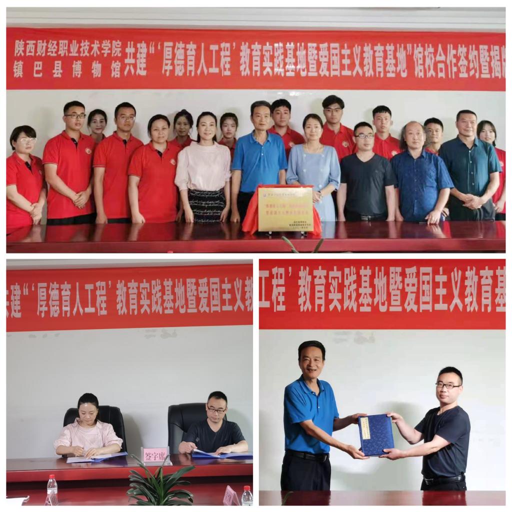 黄兴刚和窦曼娟代表双方签订合作协议。李娟和张秦龙共同为“厚德育人工程”教育实践基地暨爱国主义教育基地揭牌。张秦龙代表陕西财经职业技术学院为镇巴县博物馆赠书籍。