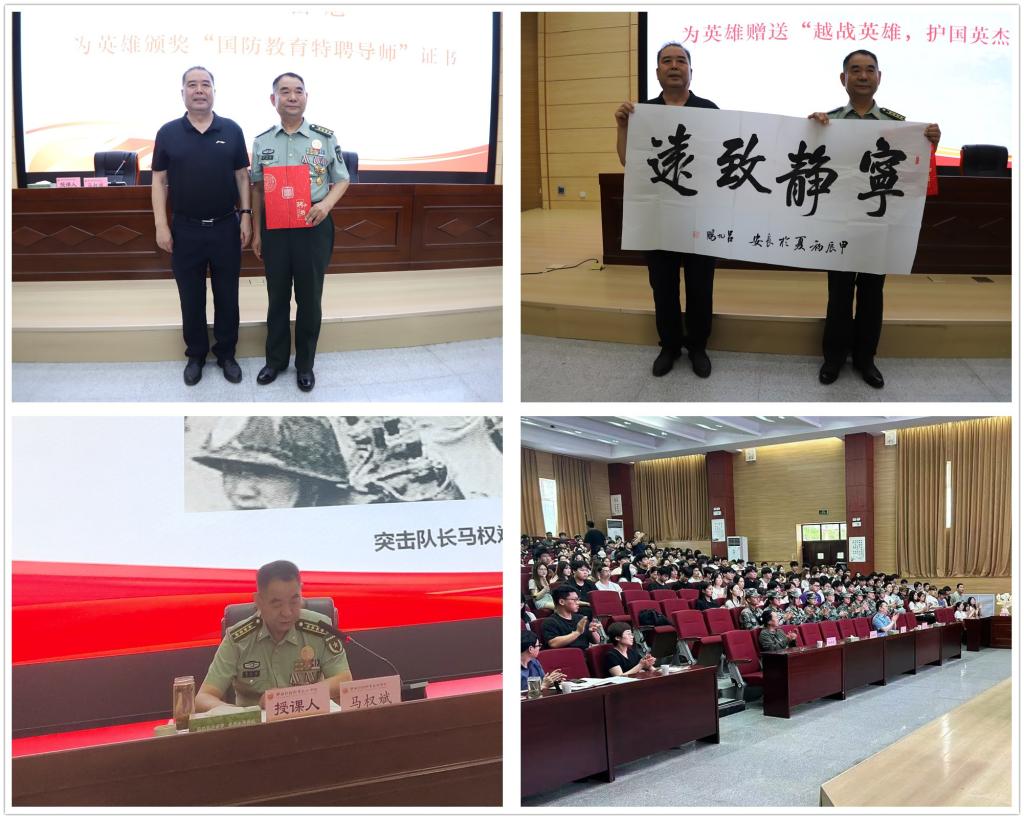 从战火中走出来的英雄楷模马权斌以《铁血铸就忠诚 荣誉高于生命》为题,以自己和战友的亲身经历,为师生们讲解了1979—1989年对越自卫反击战时期我军将士在战斗前线可歌可泣的感人事迹。他用饱满的激情、朴实的语言、真实的经历,带领大家回忆了那段血与火交织、生与死洗礼的岁月,讲述了我军以大无畏革命英雄气概克服一切困难、不怕牺牲、英勇顽强取得最后胜利的英勇事迹。他讲到:“天下兴亡,匹夫有责,作为军人,面对国家和人民的利益受到侵害就应带头听从党的召唤,挺身而出,义无反顾;作为军人,面对艰难残酷的战争环境就要带头发扬大无畏的革命精神,敢于牺牲,乐于奉献;作为军人,面对功名考验就要带头淡泊名利,视功名如鸿毛,视责任如泰山”。他和无数前线英雄的真实故事感染了会场中的每一位师生,获得了师生们经久不息的热烈掌声。