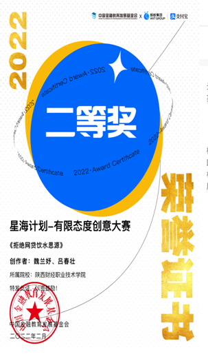 2022年2月,由中国金融教育发展基金会、蚂蚁集团主办的“星海计划——有限态度创意作品征集大赛”评审结果出炉。比赛共在全国范围内评选出30部获奖作品,我校传统文化教研室专任教师魏兰妤带领人文艺术学院2021级广播影视节目制作专业学生吕春壮的作品《拒绝网贷饮水思源》荣获二等奖。