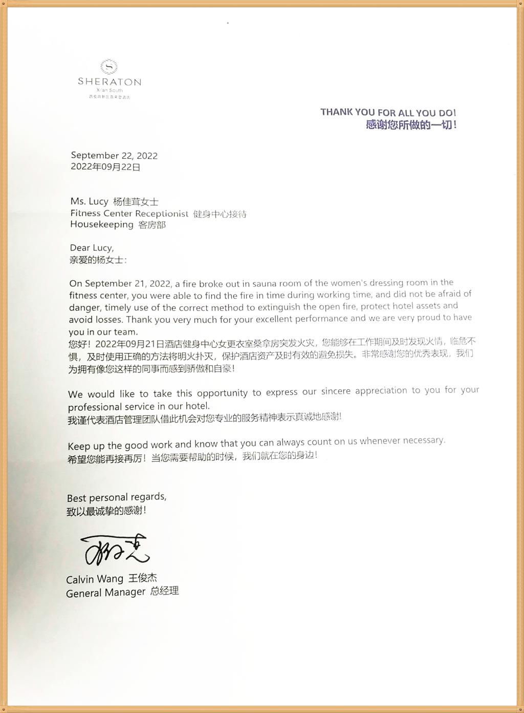 2022年9月22日,我校商学院2020级旅游管理专业杨佳茸同学收到西安市高新区喜来登酒店总经理签发的感谢信。