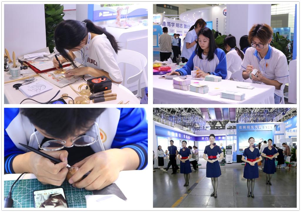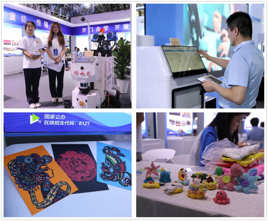 学校在2号馆设立特型展位,以全新面貌精彩亮相本届教博会。展区设计庄重大气、清新高雅,以校园文化标识和珠算造型为主要元素彰显了财经特色。通过壁挂灯箱展板、图文画册、师生作品展示、LED显示大屏系统展示的大量图文和视频,详细展现了我校实施“开门办学、开放办学、国际化办学”推进高质量发展,在党建引领、教学改革、校企合作、科学研究、国际交流合作、招生就业、社会服务、校园文化、思政教育等工作中的特色亮点和取得的丰硕成果。表演区学生的麦秆画创作、蛋壳雕刻、剪纸等手工现场制作精美雅致,空乘礼仪操表演、点钞和打传票动作行云流水,安防机器人、财务机器人科技感十足,吸引了众多考生和家长驻足咨询、欣赏。