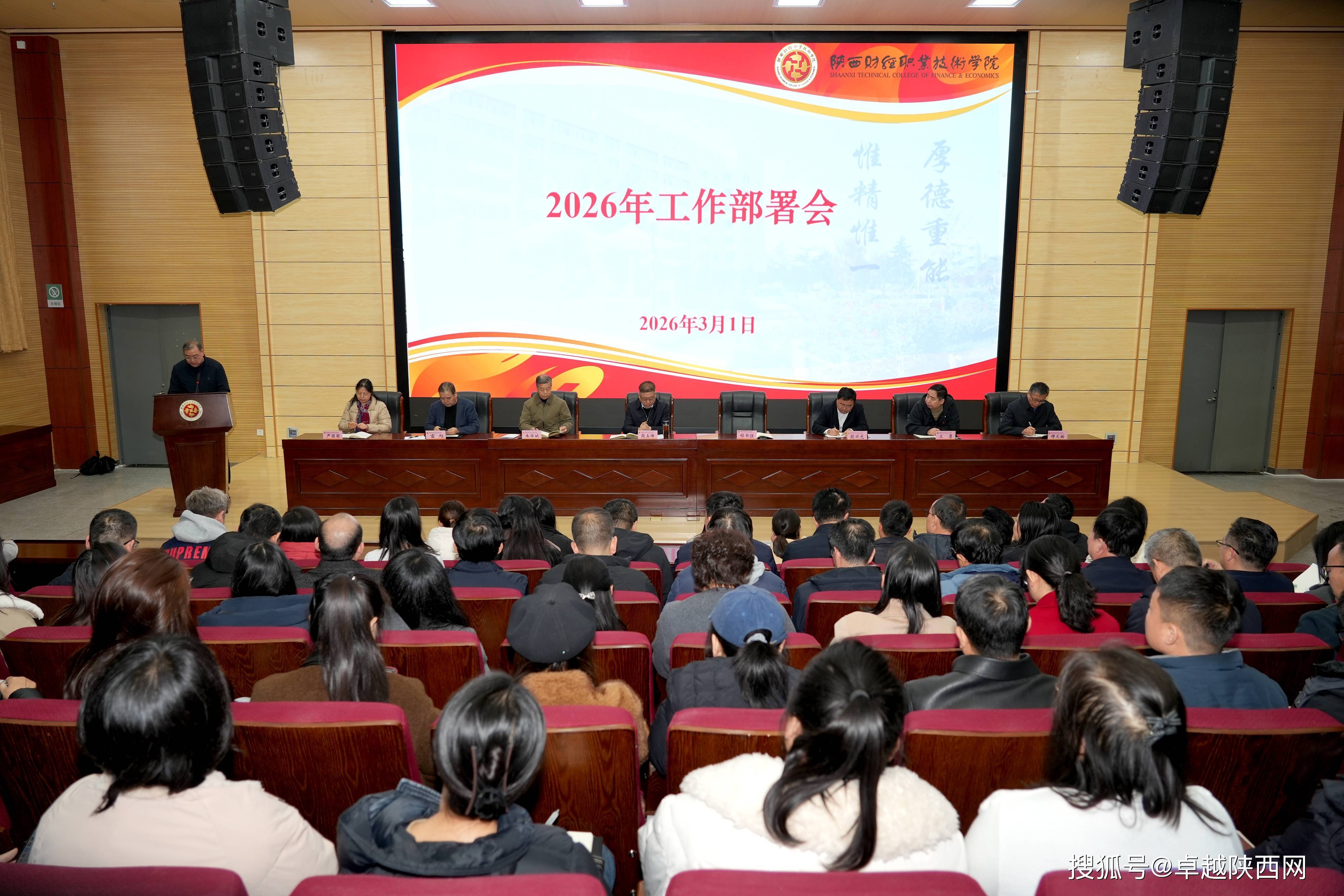 3月1日,陕西财经职业技术学院在学术报告厅召开2026年工作部署会,全面总结过往、部署全年任务,擂响新一年奋斗战鼓,吹响高质量发展集结号。学校领导班子成员出席会议,党委书记高玉峰、校长程书强分别讲话,全体教职工参加会议。会议由党委副书记朱华斌主持。
