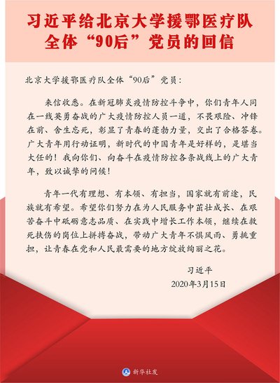 习近平给北京大学援鄂医疗队全体“90”后党员的回信