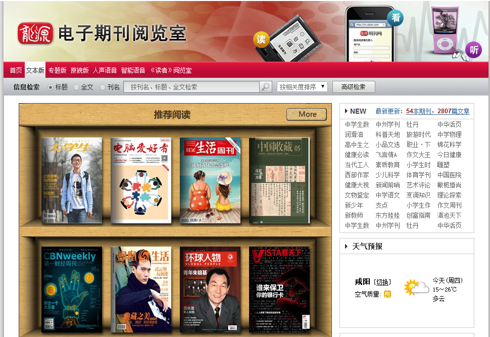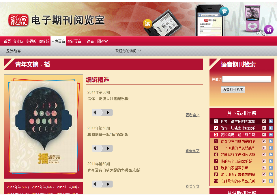 龙源期刊最大的特色就是多版立体阅读,分别是:整刊版,提供刊物的目录和全文,以及往期检索,读者可以更直接的选择自己喜爱的期刊阅读。专题版, 完全突破每本杂志的局限,按照不同的类别划分不同的专题,使读者聚焦自己感兴趣的话题。 原文原貌版, 原汁原味,再现纸板期刊原貌,无需下载安装浏览器,电子版翻阅更便捷。 语音版,打破期刊文字的束缚,让我们的期刊“动”起来,男声女声两个版本的语音阅读,变读刊为“听刊”。