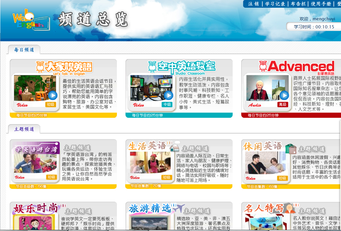 “空中英语教室英语学习节目音像库”采用“空中英语教室”的视频内容,拥有适合不同阶段的英语爱好者。分为大家说英语、空中英语教室和彭蒙惠英语三个不同层次的视频教学节目每年播出约25分钟的视频节目共930集,并有各类主题式学习频道,满足对主题学习英语的需求。现已成为众所周知的英语学习软件,产品以轻松活跃的视频剧情形式呈现丰富多彩的情景对白,推送外教正宗英语。让学生抛开课本,营造轻松幽默的环境让学习者享受英语口语学习的乐趣,并且在愉快的心情中提高英语听说能力。