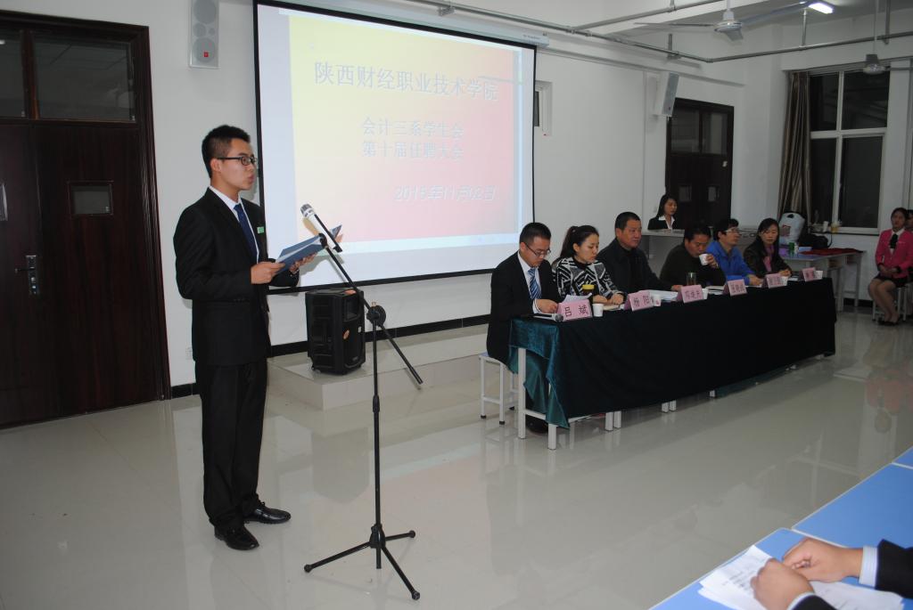 2015年11月2日星期一晚7点我院会计三系学生会换届大会在综合楼514教室召开。会计三系主任邓迪夫,专职副书记张晓战出席大会,辅导员李瑾老师,谢卫朋老师,杨阳老师,第九届系学生会主要干部及第十届系学生会全体成员参加会议,吕斌老师主持会议。