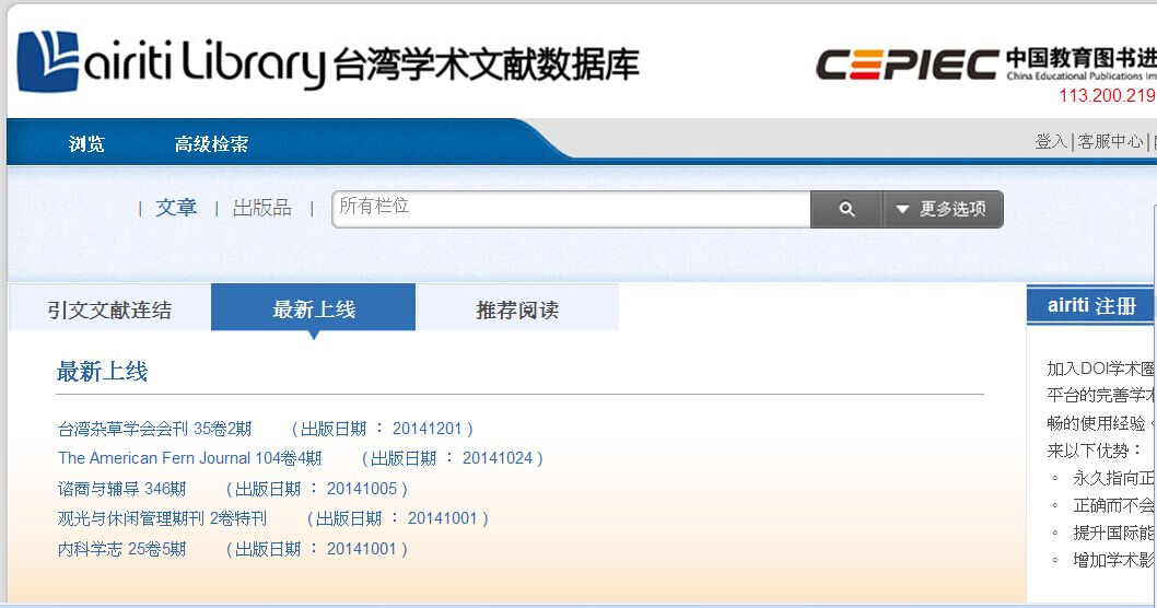 华艺-台湾学术文献数据库是台湾做学术资源最大,收录范围最广,收录资源为最核心的数据库,已成为全球图书馆查找台湾学术研究资源最重要的电子资源。包括学术期刊和硕博士论文两类资源。《台湾学术期刊数据库》收录期刊共1,552种,台湾期刊1483种。其中自然科学(理)期刊计65种、应用科学(工)期刊167种、医学期刊239种、生命科学期刊64种、人文学期刊470种、社会科学期刊776种;期刊电子全文323,028篇。收录基础:SCI、SSCI、EI、Medline、CA、TSSCI、THCI Core等指标、并以曾经获奖、符合学术论文格式以及图书馆、学者推荐为收录标准。TSSCI收全率达84%、THCI收全率达78%;《台湾学位论文数据库》是台湾最大的学位论文数据库,收录台湾51所高校78662篇学位论文,独家收录台湾大学的硕博士论文;