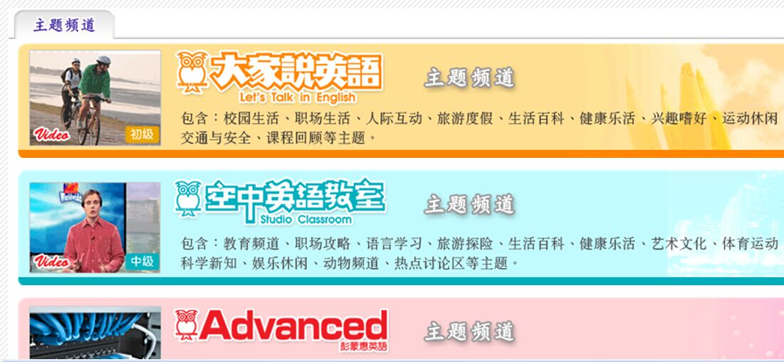 “空中英语教室英语学习节目音像库”采用“空中英语教室”的视频内容,拥有适合不同阶段的英语爱好者。分为大家说英语、空中英语教室和彭蒙惠英语三个不同层次的视频教学节目每年播出约25分钟的视频节目共930集,并有各类主题式学习频道,满足对主题学习英语的需求。现已成为众所周知的英语学习软件,产品以轻松活跃的视频剧情形式呈现丰富多彩的情景对白,推送外教正宗英语。让学生抛开课本,营造轻松幽默的环境让学习者享受英语口语学习的乐趣,并且在愉快的心情中提高英语听说能力。
