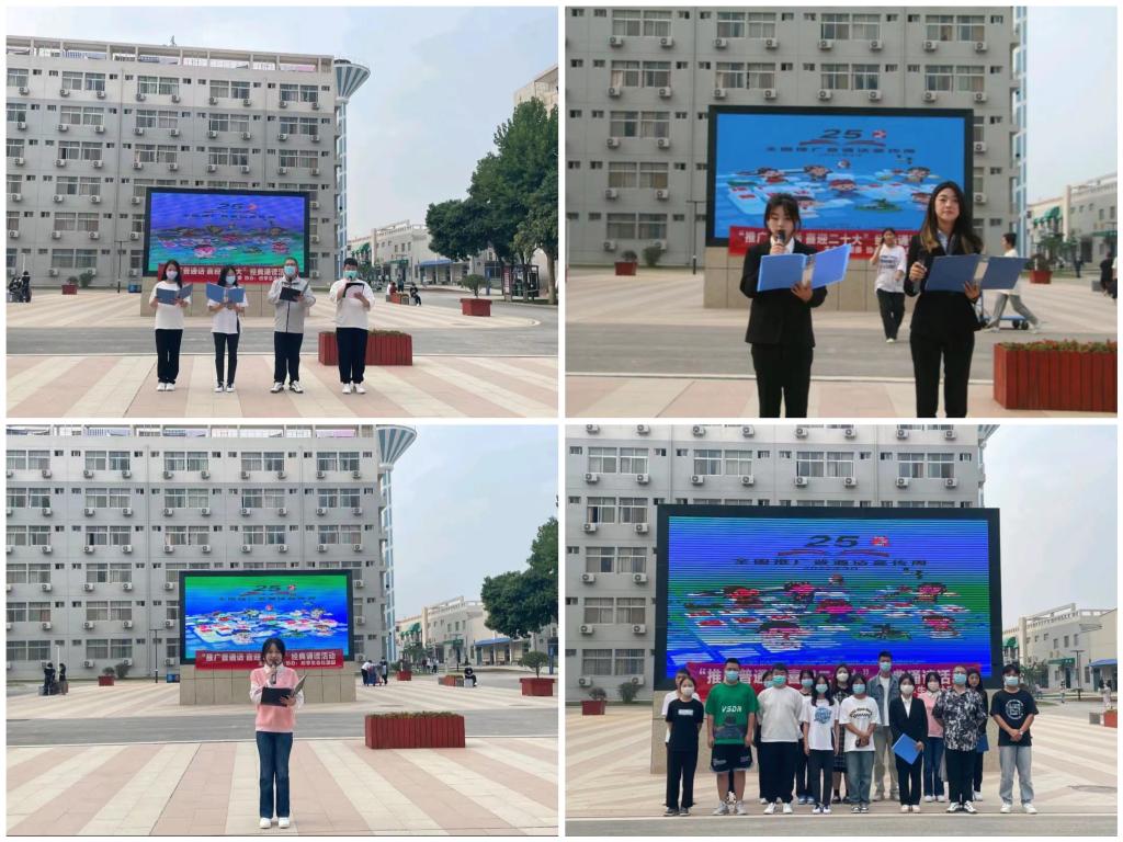 在喜迎党的二十大胜利召开之际,迎来了第25届全国推广普通话宣传周,为进一步提高广大师生的语言文字规范意识,营造良好的语言文字环境,9月16日,校团委在财经广场开展了“推广普通话喜迎二十大”经典诵读活动,校学生会社团部和团员青年40余人参加活动。活动通过钉钉平台全程直播,1000余名师生观看。