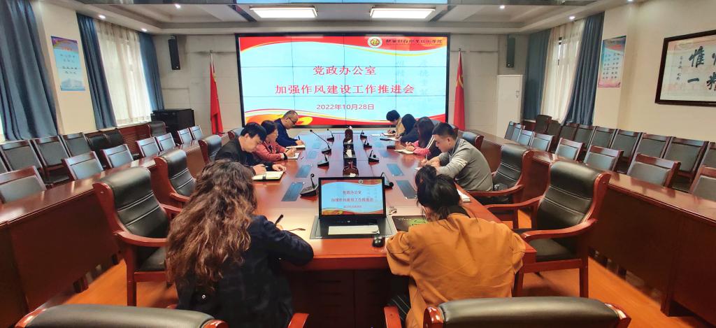 为贯彻落实党委书记张志华、院长程书强在调研指导时对党政办公室提出的工作要求,推进党政办公室切实转变工作作风、提升内涵建设、提高服务质量,10月28日上午,党政办公室召开加强作风建设专题会议,党委宣传部部长严丽丽参会,党政办公室全体成员参加。