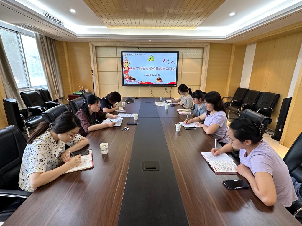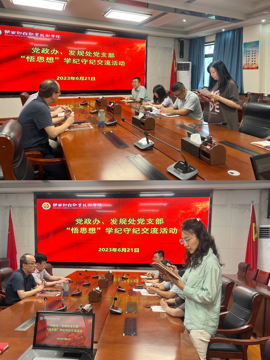 开展"悟思想"学纪守纪交流活动,持续创新活动载体。6月21日,党政办、发规处党支部组织全体党员、干部以个人自学和集体学习相结合的方式,以“清风陕财”微信公众号发布的《党员干部纪律教育学习读本》、《纪检监察干部说纪》系列视频课程为学习内容,开展了学纪守纪交流活动。会上,党员围绕学习内容逐个发言谈体会,联系工作实际分享学习心得。针对网络上及社会上一些负面情绪和过激言论,马美玲联系岗位实际分享了态度立场鲜明,敢于发声,敢于亮剑,坚决维护党中央形象的行为。雷思雨立足秘书科岗位分享了坚持每天阅读人民日报、中国纪检监察报、求是杂志等党媒党刊的良好阅读习惯,确保第一时间知晓国家大事、国家政策,以便为学院事业高质量发展贡献力量。