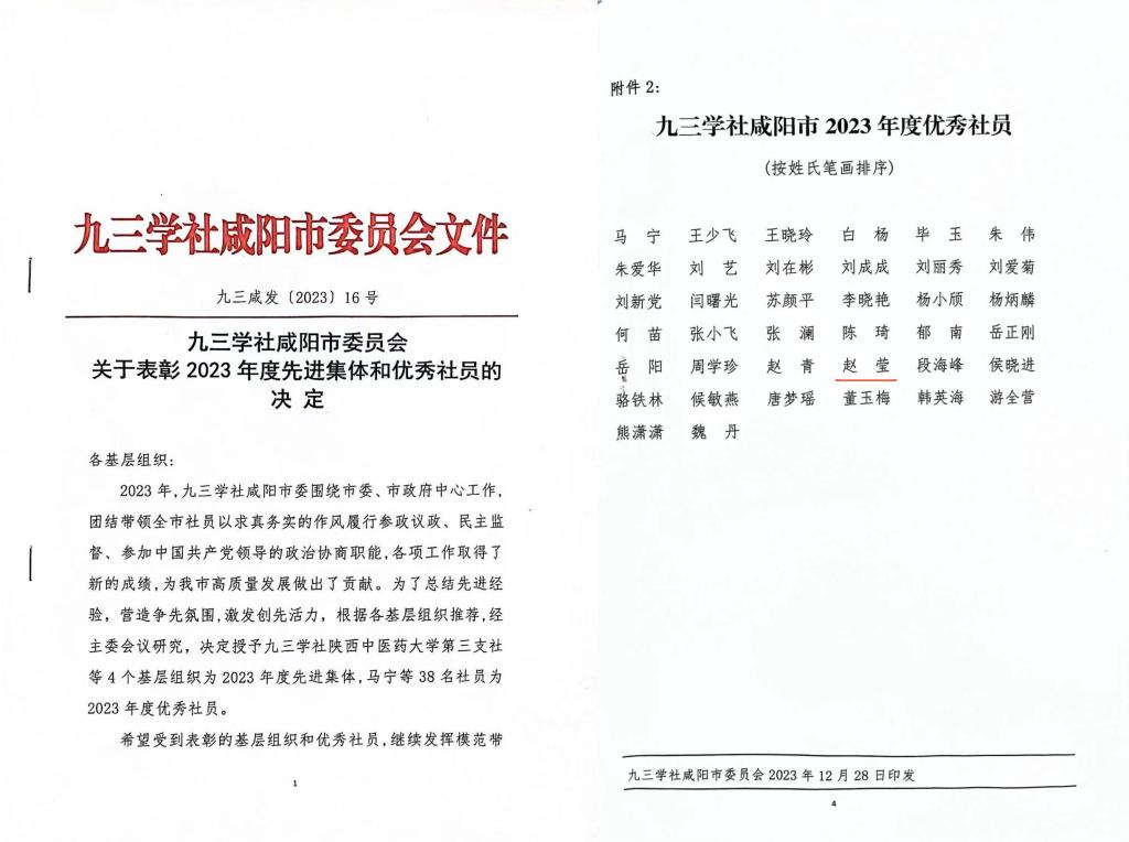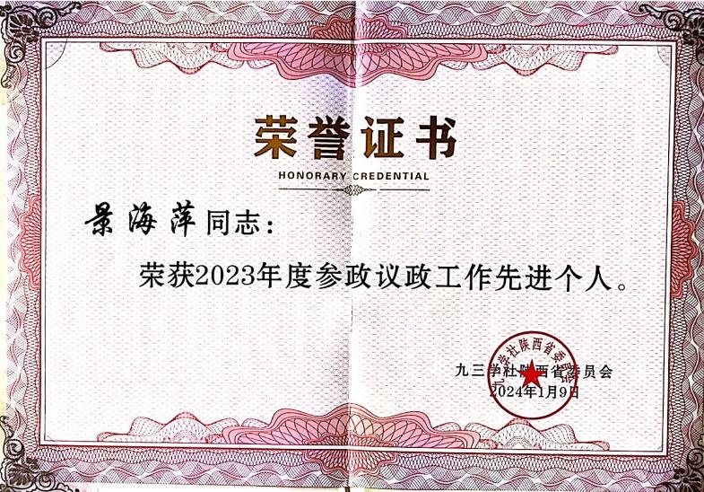 日前,九三学社陕西省委表彰了2023年度在参政议政方面取得突出成绩、做出突出贡献的先进集体和先进个人,我校九三学社社员景海萍教授被授予“2023年度参政议政工作先进个人”称号。同期,九三学社咸阳市委对一年来表现突出的先进集体和优秀社员进行了表彰,我校赵莹副教授被评为“2023年度优秀社员”。