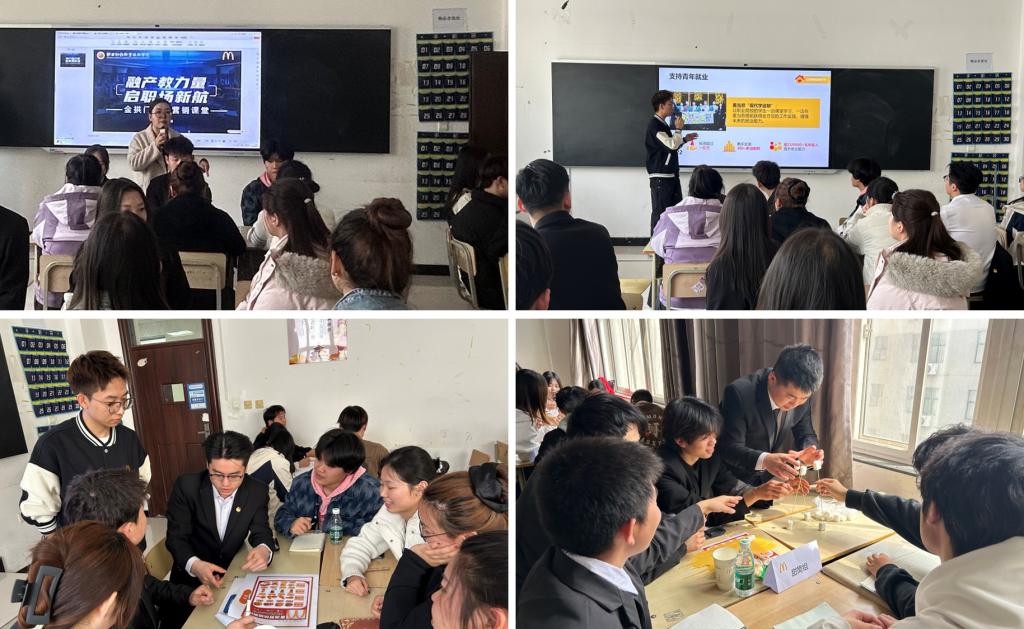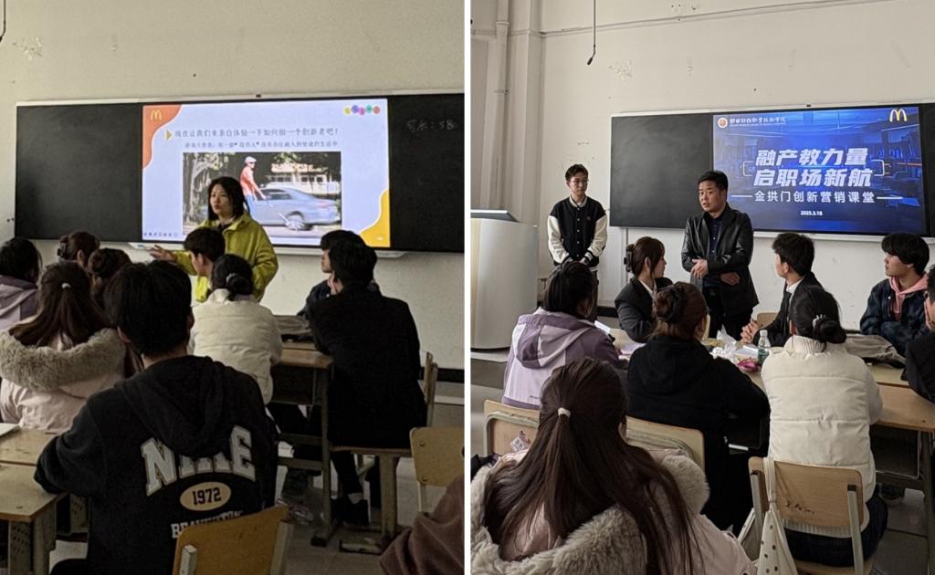 3月18日,数字商务学院与西安金拱门食品有限公司联合举办了以“融产教力量,启职场新航”为主题的校企课堂。西安金拱门人力资源专员郭文杰、实习生王悦与市场营销专业师生共同探讨了创新思维在企业实践中的应用。数字商务学院院长董媛、党总支书记张晓战、市场营销专业负责人吴红阳、教学秘书王悦悦及23级市场营销专业学生共同参与。