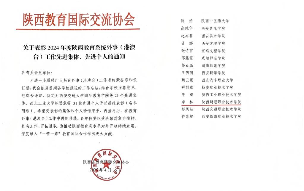 近日,陕西省教育国际交流协会发布《关于表彰2024年度陕西教育系统外事(港澳台)工作先进集体、先进个人的通报》,对全省因公出国(境)工作中的30家优秀单位和30名先进个人予以表彰。我校国际交流与合作处教师李栋荣获“2024年度因公出国(境)管理工作先进个人”荣誉称号。