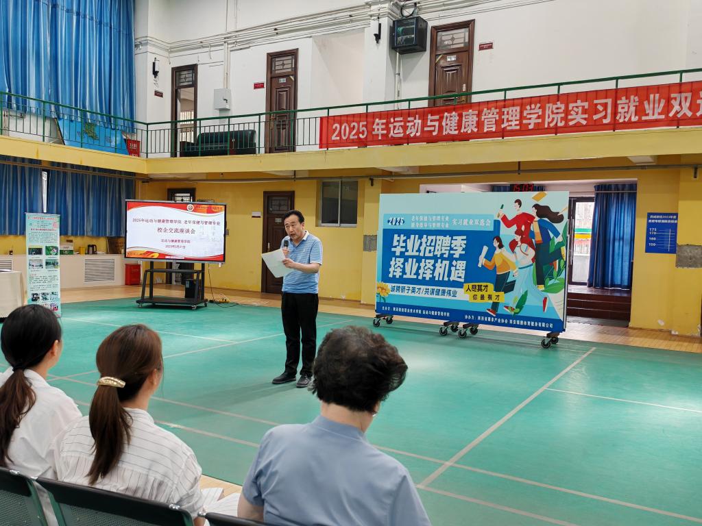 会议伊始,运动与健康管理学院书记张朴发表致辞。他回顾学院老年保健与管理专业从创立到发展壮大的历程,指出学院始终围绕市场需求优化课程设置,强化实践教学,致力于培养具备扎实专业知识与实操能力的应用型人才。书记强调,此次双选会是深化产教融合的重要举措,期望同学们把握机遇,展示自身实力;也期待与企业携手,共同为老年保健事业培育更多优秀人才。
