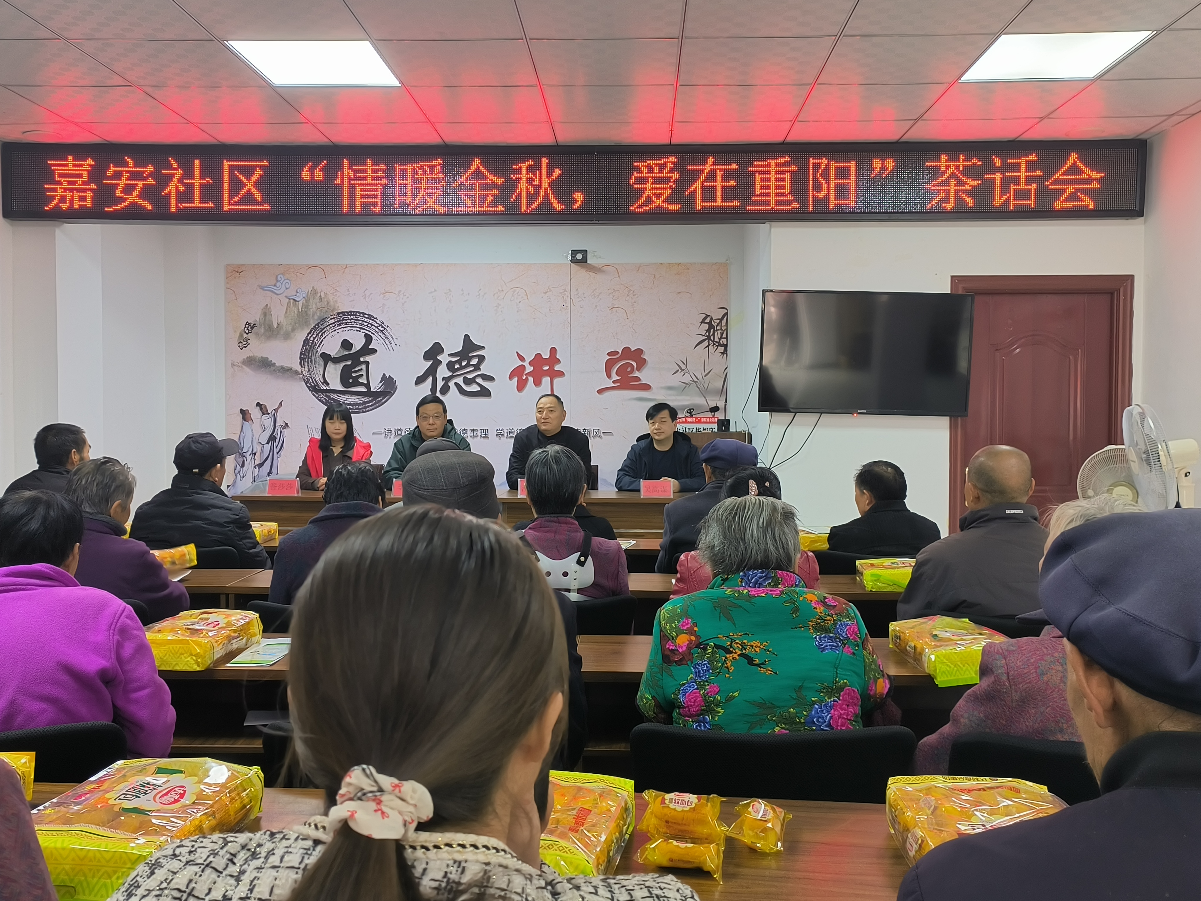 义诊结束后,“话家常,暖人心”重阳茶话会在社区道德讲堂大会议室温馨举行。我校驻嘉安社区第一书记吴高谋、驻村干部王飞与柞水县移民办主任汪翔、副主任李波、社区副书记答莎莎一同,与老年朋友们围坐一堂,品茶点、唠家常。老人们畅谈移民搬迁后的生活变化,分享晚年生活的点滴趣事,也对社区建设提出了宝贵建议。现场欢声笑语不断,气氛融洽热烈。茶话会不仅丰富了老人们的精神生活,更成为倾听民声、汇聚民意的“暖心桥”。