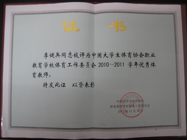 2011年12月16日至17日,中国大学生体育协会职业教育学校体育工作委员会2011年度年会在武汉软件工程职业学院召开,有近100所全国职业院校参加了会议。本次会议不但总结了职业教育学校体育工作委员会2011年的工作,而且还布署了2012年度的工作。另外大会还宣布了全国职业院校优秀体育教师的评选结果,我院体育部副主任李健兵同志被评为2010—2011学年全国职业院校优秀体育教师荣誉称号。
