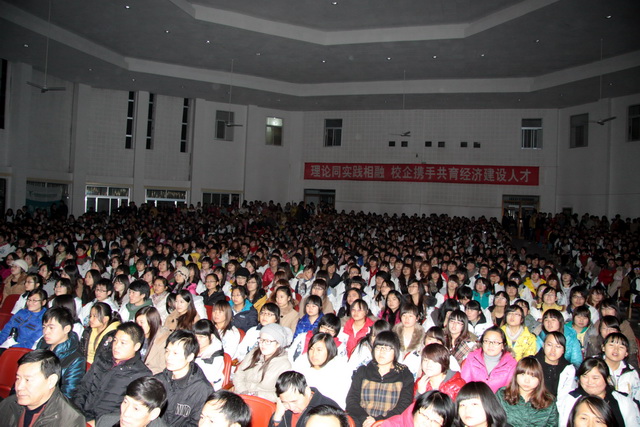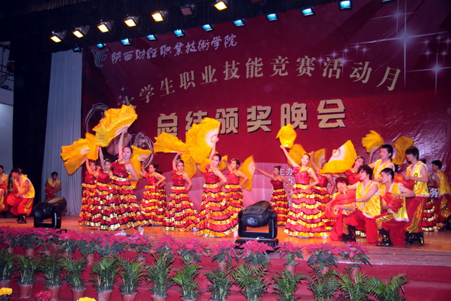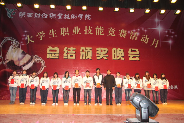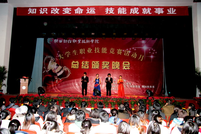 2011年12月8日晚7时30分,陕财职院2011大学生职业技能竞赛活动月总结颁奖晚会在学院大礼堂隆重举行。学院院长阎平老师,副院长刘晓玉老师,副院长王文汉老师,党委副书记兼纪委书记刘文雅老师,学院办公室、教务处、学工部、教育教学研究室、教学评估督导室和四个系部的有关领导、老师及各班级学生代表共1400余人出席了本次晚会。