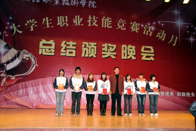 本次颁奖晚会由教务处主办,信息工程系承办,其他各系部协办。信息工程系副主任郭崇罡老师任总策划,演职人员共240余人。主要为我院会计手工技能竞赛、会计电算化、办公应用技能竞赛、沙盘模拟经营竞赛、金融模拟炒股、工程预算、寿险营销技能大赛的获奖同学颁奖。依照学院规定,各项竞赛分设个人一、二、三等奖及团体奖,经诸位评委老师严格评审,来自四个系部三百多名同学在竞赛中脱颖而出。学院领导阎平老师、刘晓玉老师、王文汉老师、刘文雅老师先后为获奖同学、班级颁奖,并合影留念。