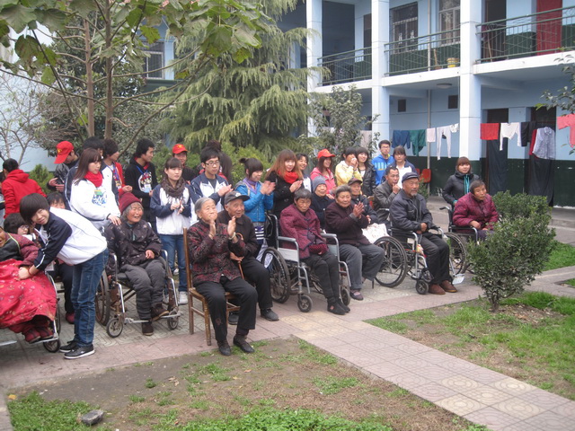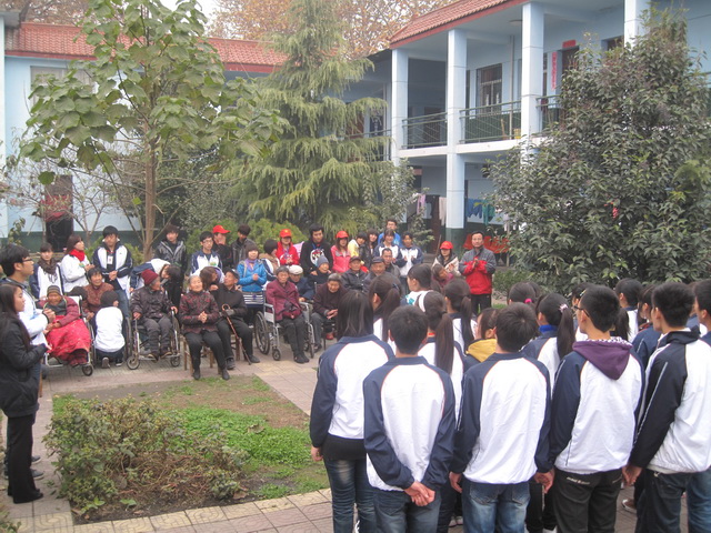 9时半,同学们开始在院子里表演起节目,有独唱、合唱、相声、华尔兹,老人们在同学们的陪护下坐在一起,欣赏节目,他们显得十分开心,不时鼓掌,69岁的吴玉兰老人流下了高兴的泪水。78岁的董玉兰老人被同学们的热情感染了,她主动要求也给同学们表演节目,她唱的是秦腔《赵五娘吃糠》、《红灯笼》和歌曲《社会主义好》,在唱《社会主义好》的时候,同学们不由自主的跟着她一起唱了起来,老人的独唱顿时变成了合唱,其情其景,感人至深。