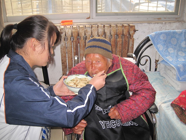 11:30,热气腾腾的饺子被同学们端到了每个老人的手里,看到同学们的笑脸,看着碗中的饺子,老人们有些哽咽,几分钟后才开始吃饺子。对于那些行动不便、不能自理的老人,同学们就给他们喂着吃。老人们都说孩子们懂事,这顿饺子是这几年中吃得最舒心、最有味道的一顿饭。他们都比往常多吃了一些,并劝说孩子们也吃一些饺子。24名孤寡老人和工作人员吃饱之后,还剩的好几百个饺子,全部下锅,饺子出锅后,同学们围了两圈,每人都尝了几个,愉快地分享着自己的劳动成果。