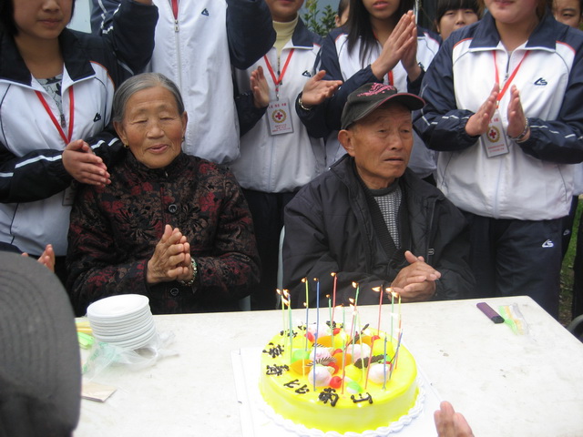 12:30,太阳出来了,老人们坐在院子里,晒着太阳,同学们围成一圈,开始给杨国栋老人过生日,插蜡烛、齐唱生日歌、吹蜡烛、切蛋糕、吃蛋糕,有条不紊。同学们齐声祝福爷爷奶奶们身体健康、寿比南山!在列队返校的时候,两个腿脚比较灵便的老人一定要送送同学们,李媛、李蕾同学搀扶着他们说,你们保重身体,回房休息,我们每个礼拜六都会来看望你们的。