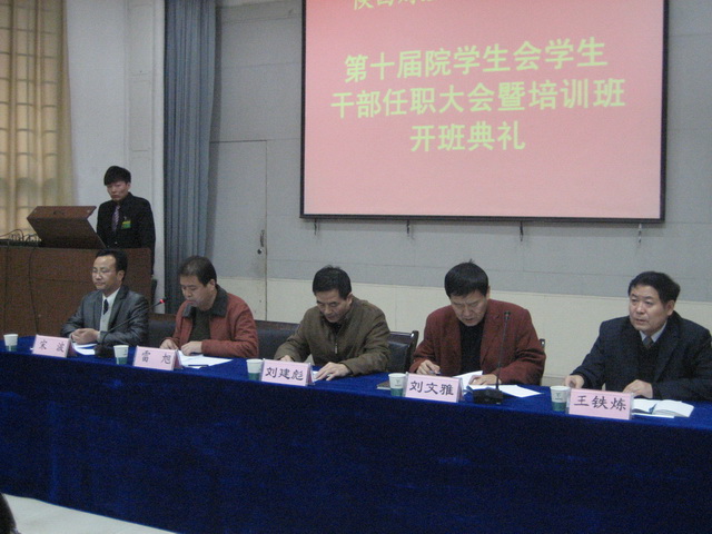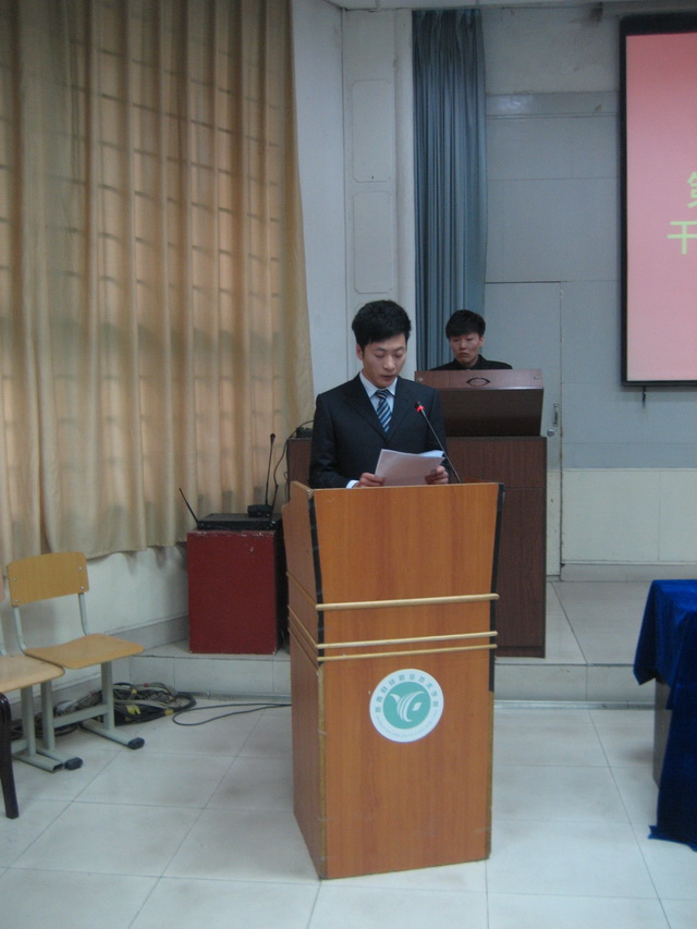 4时30分,大会在雄壮的国歌声中开始。雷旭部长宣读了我院第十届院学生会干部任职决定,第三届宿管会主席田哲同学主持了学生干部入会仪式,第十届院学生会主席团委员乔兵同学代表全体学生干部作了表态发言,王铁练副部长安排部署了本次学生干部培训工作,刘文雅副书记作了重要讲话。